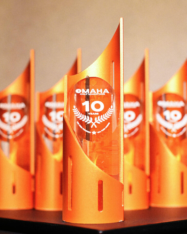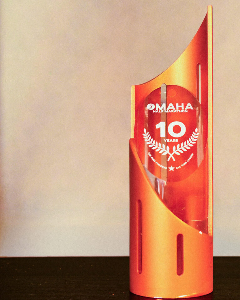 And if you do, we have something very special to give you in return. Every person who achieves a finish in ten Omaha Half Marathons will receive one of these beautiful crystal and metal 10 year finisher trophies and have their names recorded here for posterity.